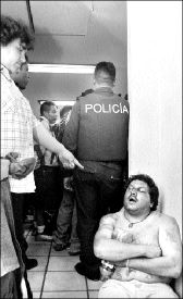 de la derecha, el agente Julio Moctezuma trata de tapar la cámara