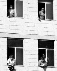 Participantes en la invasión a una unidad habitacional en la colonia Vallejo se asoman por las ventanas de los departamentos. Poco después desalojaron el lugar FOTO ALFREDO DOMINGUEZ