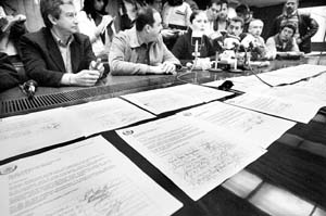 Mientras sigue el jaloneo entre opositores y la burbuja de Elba Esther Gordillo, la Comisión Política Permanente del tricolor sesionará mañana para discutir el desconocimiento de la maestra como jefa de bancada, fijar fecha y método de elección del sucesor y definir si permanece como número dos del CEN, cuyo presidente, Roberto Madrazo, ya le dio la espalda. En la imagen, diputados muestran las firmas de quienes se rebelaron FOTO JOSE CARLO GONZALEZ