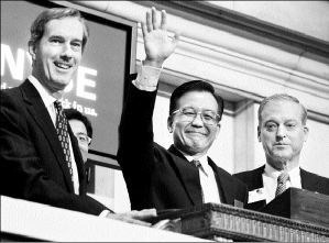 El premier chino, Wen Jiabao, fue el encargado de abrir ayer las operaciones de la bolsa de Nueva York FOTO REUTERS