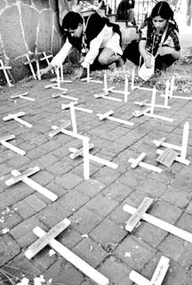 Organismos defensores de derechos humanos y partidos políticos piden se deslinde la responsabilidad que en la matanza tuvieron Ernesto Zedillo, Emilio Chuayffet y Julio César Ruiz Ferro. Intocable, la maraña de vínculos militares y civiles priístas. En las consignaciones, sólo personajes menores. Los 45 indígenas asesinados, testigos mudos de la injusticia. La gráfica fue captada ayer en Coyoacán FOTO MARCO PELAEZ