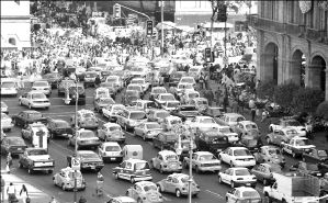 Asentamiento vehicular, en la esquina de Plaza de la Constitución y Pino Suárez, ayer 23 de diciembre FOTO MARIA MELENDREZ PARADA