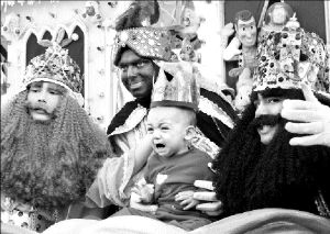 El pequeño no parece feliz al fotografiarse entre los Reyes Magos