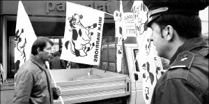 CONFIESA TANZI DESVIOS EN PARMALAT  Granjeros italianos protestan frente a una fábrica de Parmalat, cerca de la ciudad de Parma. El fundador del gigante alimentario, Calisto Tanzi, quien fue arrestado por presuntos delitos financieros, admitió ya que desvió fondos de su compañía, informó uno de sus abogados defensores FOTO AFP