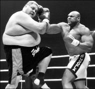 El jugador estadunidense de la NFL, Bob Sapp (derecha), ganó por nocaut técnico al luchador de sumo Taro Akebono, en contienda efectuada en Nagoya FOTO AFP