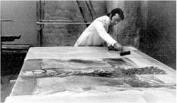 ''Por el reverso se vinieron unos pedazos del aplanado de cal y arena, pero con unos martillos de goma se eliminaron y sólo quedó la pura película de color -su espesor es el de un ala de mariposa- adherida a las telas. Una vez eliminados los excedentes de cal y arena el mural se pudo enrollar y ser llevado, claro, con un soporte interior para que no fuera a doblarse."