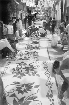 ALEGRA VER cómo la comunidad tiene sabiduría para conservar y transmitir su cultura. Los niños, los jóvenes y los padres trabajan juntos; familias y vecinos colaboran con gran espontaneidad en la elaboración de los tapetes multicolores. Más de un kilómetro de arte efímero llena los ojos y los corazones de los pobladores y los visitantes. Los tapetes se extienden desde la iglesia principal hasta la capilla de Guadalupe, ubicada donde surgen los veneros que abastecen parcialmente de agua a la población. Grupos de damas, madres de familia y jóvenes preparan la comida para los que trabajan en esta actividad colectiva; diligentes, reparten los platos servidos con abundancia. Nadie se queda sin comer.