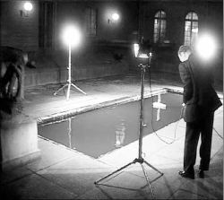 El barco flotaba sobre una pileta rectangular llena de agua pintada de