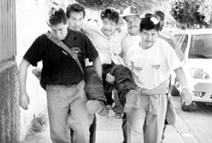 Traslado de un miembro de la Coordinadora Estatal de Trabajadores de la Educación de Guerrero que resultó herido en Iguala en el enfrentamiento con integrantes del SNTE. La disidencia magisterial exigió que se esclarezcan los hechos de violencia, al tiempo que responsabilizó a la cúpula del sindicato y a Elba Esther Gordillo de la represión contra opositores FOTO ALEJANDRINO GONZALEZ /NOTIMEX
