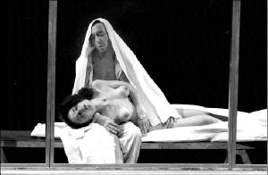 DENTRO DE ESTE revisionismo cristiano, la puesta en escena proyecta una imagen no carente de polémica pero plena de significado: una piedad inversa, donde el Cristo que yace tiene cuerpo de mujer y la madona que aparece de varón. "¿Qué hubiese pasado si Cristo hubiera sido mujer? ¿Cómo hubiera sido la historia?" se pregunta Hevia.
