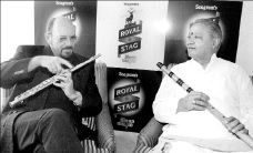 El flautista de la banda británica de rock Jethro Tull, Ian Anderson, y su homólogo de la India, Pandit Hariprasad Chaurasia, al anunciar los conciertos que ambos ofrecerán este fin de semana en Bombay FOTO REUTERS