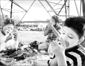 MANITA DE PAYASO  Los hermanos Johathan, Miguel Angel y José Roberto Silva Cepeda casi listos para iniciar un día más de trabajo en Toluca, estado de México
