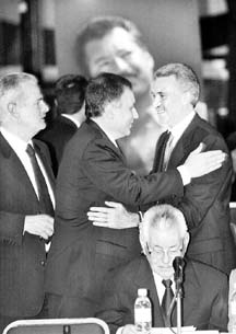Luis Colosio Fernández (abajo, frente al micrófono) aseguró, en una ceremonia en el Polyforum Cultural Siqueiros, que su hijo fue ultimado en un clima de profundo deterioro de sus relaciones con el ex presidente. En la imagen también aparecen Francisco Labastida, Roberto Madrazo y el vocero presidencial Alfonso Durazo (al centro), quien aseguró que al gobierno foxista le ha faltado "voluntad política" para resolver ese asesinato y otros crímenes FOTO MARCO PELAEZ