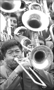 Bolivianos actúan en la Plaza Cívica de Oruro, 200 kilómetros de La Paz, en lo que fue un ensamble de 5 mil músicos provenientes de 53 bandas, que tocaron al unísono FOTO REUTERS