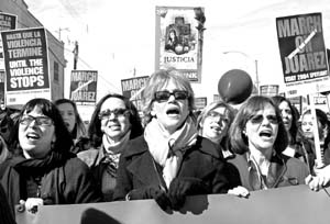 La dramaturga Eve Ensler y las actrices Jane Fonda y Sally Field, todas estadunidenses, se unieron a las mexicanas Lilia Aragón, Laura Flores (las cinco en la imagen) y miles de personas más que marcharon en Ciudad Juárez para deplorar los homicidios contra mujeres, que ya son más de 350 en 10 años, y demandar justicia. Algunas de las visitantes se dijeron "sorprendidas" por la falta de voluntad oficial en aras de esclarecer los crímenes y por la "apatía" de la sociedad mexicana ante la tragedia. En el puente internacional Santa Fe, en tanto, integrantes de la llamada "Red Estatal de Derechos Humanos" intentaron disuadir a transeúntes de participar en la protesta y criticaron la presencia de artistas extranjeras FOTO JORGE UZON /AFP