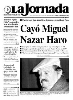 Miguel Nazar Haro, ex director de la Dirección Federal de Seguridad, demacrado, con el cabello crecido y bajo de peso, en una toma de ayer en el hangar de la Procuraduría General de la República. Hace un año, en una entrevista con este diario, el ex policía dijo: "¡Mi pinche vida fue muy activa!" Casi como un epitafio, sentenció: "Después de vencedor, vencido en el ocaso de mi vida..." FOTO CORTESIA DE LA PGR