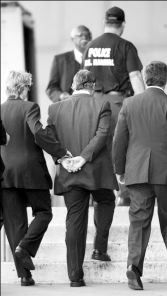 de seis abogados y, con las esposas puestas, el hombre que dirigiera a