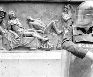 Al pie del monumento a Cuauhtémoc, un granadero cumple su