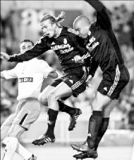 El inglés David Beckham y Ronaldo, del Real Madrid, saltan en un intento de cabecear el balón. Al caer, el brasileño se lesionó el muslo izquierdo FOTO AFP