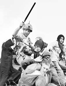 Las tropas abrieron fuego contra los pobladores de los campos de refugiados de Bureij y Nusseirat, que rechazaron el toque de queda. La acción, informó Tel Aviv, fue "para impedir ataques terroristas". Los grupos de resistencia palestinos prometieron venganza. En la imagen, un guardia fronterizo reprime a manifestantes cerca del muro levantado por el gobierno de Sharon FOTO REUTERS