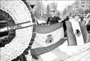 de flores y pancartas con la leyenda "España, México está
