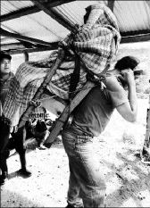 "En un par de horas los hombres de la comunidad se organizaron para trasportar a Marcela, que no podía caminar, a su casa en las montañas. Con un machete, una silla, palos y lazos, armaron un transporte para sentar a la madre, y salieron con Marcela a cuestas. Lo más difícil fue pasar el puente colgante. El río llevaba mucha corriente. Un fuerte viento amenazaba con sacudir la 'hamaca', los miembros de la comitiva tenían que pasar uno por uno. Y uno por uno se fueron turnando el lugar de cargador."