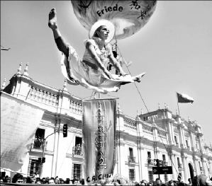 La compañía catalana de teatro Els Comediants durante la realización de un performance frente al palacio presidencial de La Moneda, en Santiago de Chile, para conmemorar el centenario del nacimiento de Pablo Neruda. El poeta chileno, laureado con el Nobel de Literatura en 1971, murió el 23 de septiembre de 1973, días después de que el presidente socialista Salvador Allende fuera derrocado por el golpe de Estado encabezado por Augusto Pinochet FOTO REUTERS