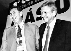 Cuauhtémoc Cárdenas Solórzano, ex candidato presidencial, y Andrés Manuel López Obrador, jefe del Gobierno del Distrito Federal, se saludaron para la fotografía durante el arranque del congreso del PRD, en el que el primero exigió la renuncia del CEN salvo el presidente, Leonel Godoy FOTO JOSE CARLO GONZALEZ