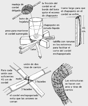 LA FORMA para construirlos es relativamente sencilla. Se fija un cuchillo en una base, se pasa el carrizo seco dividiéndolo en dos; se repite la operación para dividirlo en cuatro. Con esas tiras flexibles y fuertes se hacen aros amarrando con cordel enchapopotado ambos extremos de la tira; los aros se van uniendo con amarres a tiras de carrizo que corren en sentido perpendicular.