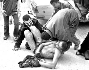 Un palestino es levantado por sus compañeros luego de una incursión de Tel Aviv en el campo de refugiados de Rafah. El primer ministro israelí hizo extensivas sus amenazas contra el dirigente de Hezbolla a Yasser Arafat. La ANP respondió que Sharon "juega con fuego" FOTO REUTERS
