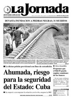 Más de 50 desaparecidos, 44 heridos y unos 4 mil damnificados causó la avenida del río Escondido debido a las intensas lluvias en la sierra de Coahuila el pasado domingo. La altura de la corriente alcanzó más de dos metros y golpeó a siete colonias. Más de 2 mil 500 viviendas fueron afectadas y de ellas 300 resultaron totalmente destruidas; las vías del tren quedaron deformadas por completo. Se dijo que el desbordamiento comenzó a las 20 horas de ese día, pero no se avisó a la población. "La fuerza del agua fue impresionante; no hubo tiempo de reaccionar", dijeron autoridades municipales. Vicente Fox acudió a la zona y ordenó el auxilio inmediato a la población FOTO CARLOS RAMOS MAMAHUA