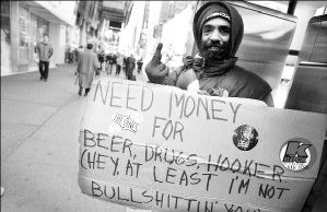 EN LA GRAN MANZANA  Las extremas disparidades neoyorquinas tienen cabida en Times Square, lo mismo corredores de bolsa que un hobo, como éste que solicita monedas para sus únicos tres vicios: cerveza, drogas y prostitutas, aunque eso sí, aclara que su petición es franca FOTO AFP