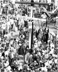 Viene la hora de la verdad, la del desmadre. Los periodistas se adelantan. Les impide el paso la guardia romana, compenetrada en su papel. Ellos abren el paso. El gusano humano avanza por las calles con los sacerdotes malditos al frente y Cristo secundando.