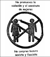 ESE DIA, EL Colectivo de Mujeres Lesbianas, Punks y Anarquistas repartieron volantes con la imagen referida, en la cual se aprecian dos siluetas: una, masculina, que encañona directo a la cabeza de una imagen femenina. En la propaganda repartida por las chavas, el dibujo es tachado y se lee la siguiente consigna: "No compres basura sexista y fascista". Después de repartir su papeleta, el colectivo feminista se dirigió a donde se venden esas playeras y conminaron al locatario a sacar de circulación dicha prenda, "con agresividad, lo que es una falta de respeto", adujo el vendedor, "además, es una playera que se ha vendido desde hace mucho tiempo". El grupo de féminas contestó a los reclamos del indignado comerciante con frases -escritas y voceadas- como: "¿sabes que al portar esta clase de basura promueves la violación y el asesinato de mujeres entre las cuales podría estar tu madre, tu hermana, tu compañera o tu abuelita? ¿Sabías que más de 4 mil 500 mujeres han sido desaparecidas y cruelmente asesinadas en Ciudad Juárez, Chihuahua, en tan sólo 10 años? Al emprender la retirada, las chavas decían, entre resignadas y molestas: "Nomás nos vamos... y la vuelven a poner".