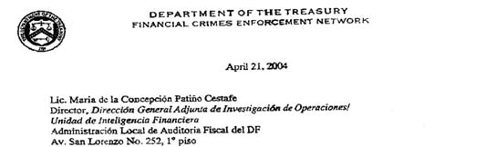 Parte superior del documento enviado por el Departamento del Tesoro a autoridades mexicanas