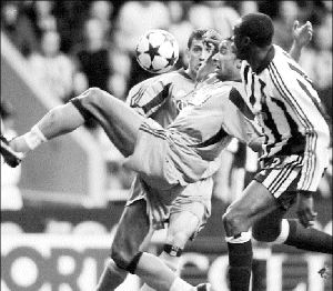 COPA UEFA  En una jornada sin goles, de semifinales de ida de la Copa UEFA, este jueves empataron los españoles Villarreal y Valencia, al igual que los ingleses del Newcastle frente a los visitantes franceses del Olympique de Marsella. En la gráfica, Habib Beye, del Olympique (centro), busca quedarse con el balón ante la marca de Shoia Ameobi, del Newcastle (derecha) FOTO AFP