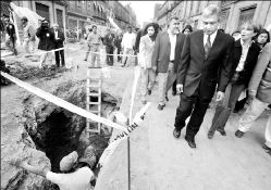 trabajadores al paso de la numerosa comitiva de funcionarios y reporteros: