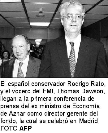 Rato, de 55 años y doctor en economía, fue designado ayer para suceder en el cargo al alemán Horst Koehler, con lo que se convirtió en el primer español en asumir la dirección del organismo financiero internacional, en gran medida gracias al apoyo de la mayoría de los países europeos y de América Latina.