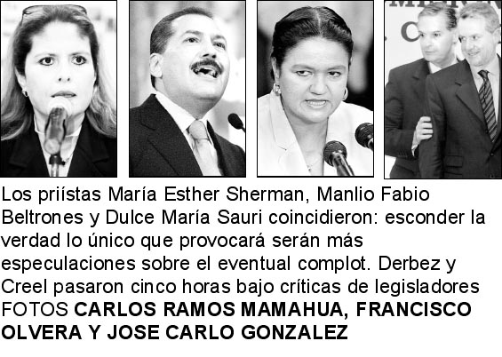 El perredista Gilberto Ensástiga dijo al titular de la política interna: "O usted no tiene información o la Secretaría de Gobernación se está convirtiendo en una fábrica de mentiras", y los priístas Dulce María Sauri, Manlio Fabio Beltrones y María Esther Sherman advirtieron que la actitud de esconder la verdad lo único que provocará es más especulación y más rumores sobre un complot impulsado desde las alturas del poder.