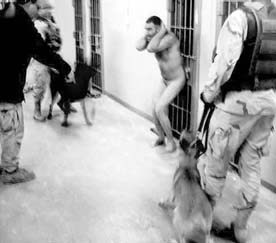 El semanario The New Yorker divulgó una nueva fotografía de la cárcel de Abu Gharib, en la que soldados estadunidenses amedrentan con dos perros a un prisionero iraquí desnudo. Informó que existen tomas del mismo hecho que muestran al reo sangrando en el suelo FOTO REUTERS/ CORTESIA DE THE NEW YORKER