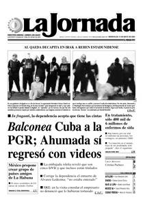 En una grabación divulgada en un sitio de Internet, la organización Muntada al-Ansar Islamist exhibió la ejecución de Nicholas Berg, de 26 años de edad -quien desapareció en abril y cuyo cadáver fue hallado el pasado sábado en Bagdad-, en "represalia" por las torturas a las que han sido sometidos prisioneros iraquíes por soldados estadunidenses. Las imágenes muestran el momento en que el verdugo saca un cuchillo y cercena el cuello del estadunidense. Por otra parte, Newsweek y el Washington Post revelaron que funcionarios del Pentágono y del Departamento de Justicia aprobaron interrogatorios que violan la Convención de Ginebra. Según esas fuentes, la puesta en práctica de esas "técnicas" era autorizada por Donald Rumsfeld FOTO AFP