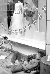 un hombre descansa bajo un aparador promocional en una calle de Copenhague