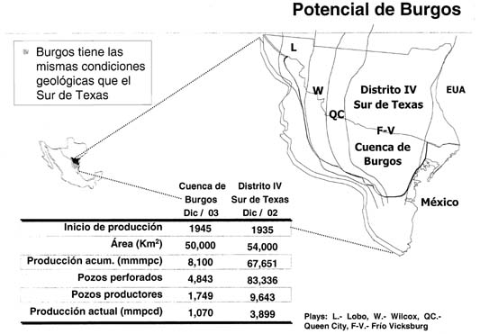 Con los cinco bloques adjudicados en la cuenca de Burgos, localizada entre Nuevo León, Coahuila y Tamaulipas, se ha logrado aumentar la producción en 425 mil millones de pies cúbicos al día, y con la próxima licitación de los otros tres bloques se llegará a una producción adicional de 350 mil pies cúbicos diarios. Consideró que la meta de lograr una producción de mil millones de pies cúbicos diarios adicionales se alcanzará en 2007.