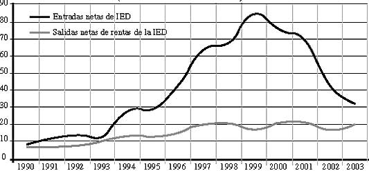 (IED) y salida de rentas, en milles de millones de dólares. En América