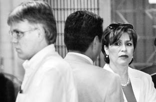 Carlos Imaz y Rosario Robles se presentaron ayer a una diligencia judicial. La ex jefa de Gobierno capitalino presentó una copia certificada de una declaración ministerial de Carlos Ahumada como "prueba" contra las aseveraciones del ex delegado en Tlalpan de que ella le pidió recibir dinero del empresario argentino. El indiciado dijo que la acción es ilegal porque ella no puede utilizar en juicio ese documento FOTO FRANCISCO OLVERA