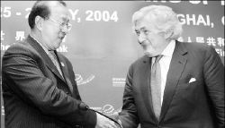 El ministro chino de Finanzas, Jin Renqing, y el presidente del Banco Mundial, James Wolfensohn, tras el encuentro con la prensa de Shanghai, donde hicieron declaraciones acerca de la conferencia global sobre reducción de la pobreza FOTO AFP