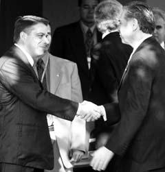 Felipe Pérez Roque y Luis Ernesto Derbez se despiden tras su reunión en un hotel de Guadalajara FOTO CARLOS RAMOS MAMAHUA