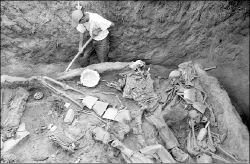 GUERRA SUCIA EN GUATEMALA  Un antropólogo limpia el perímetro de la fosa clandestina con nueve osamentas de víctimas que fueron secuestradas por el ejército en la década de los años 80 en la comunidad de San Juan Comalapa. Ayer se firmó el acta de ratificación del compromiso de apoyo al programa de dignificación y apoyo a víctimas del conflicto armado interno, en el contexto de la exhumación en el cementerio clandestino del destacamento militar del lugar, donde se han recuperado unas 150 osamentas FOTO EFE