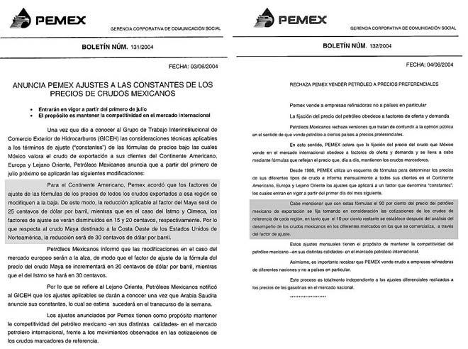 En el boletín 131/2004, fechado el 3 de junio de 2004, la paraestatal precisa: "para el continente americano, Pemex acordó que los factores de ajuste de las fórmulas de los precios de todos los crudos exportados a esa región se modifiquen a la baja. De este modo, la reducción aplicable al factor del Maya será de 25 centavos de dólar por barril".