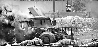 Soldados estadunidenses yacen cerca de un vehículo Humvee en llamas alcanzado en Bagdad por un misil de la resistencia iraquí FOTO REUTERS